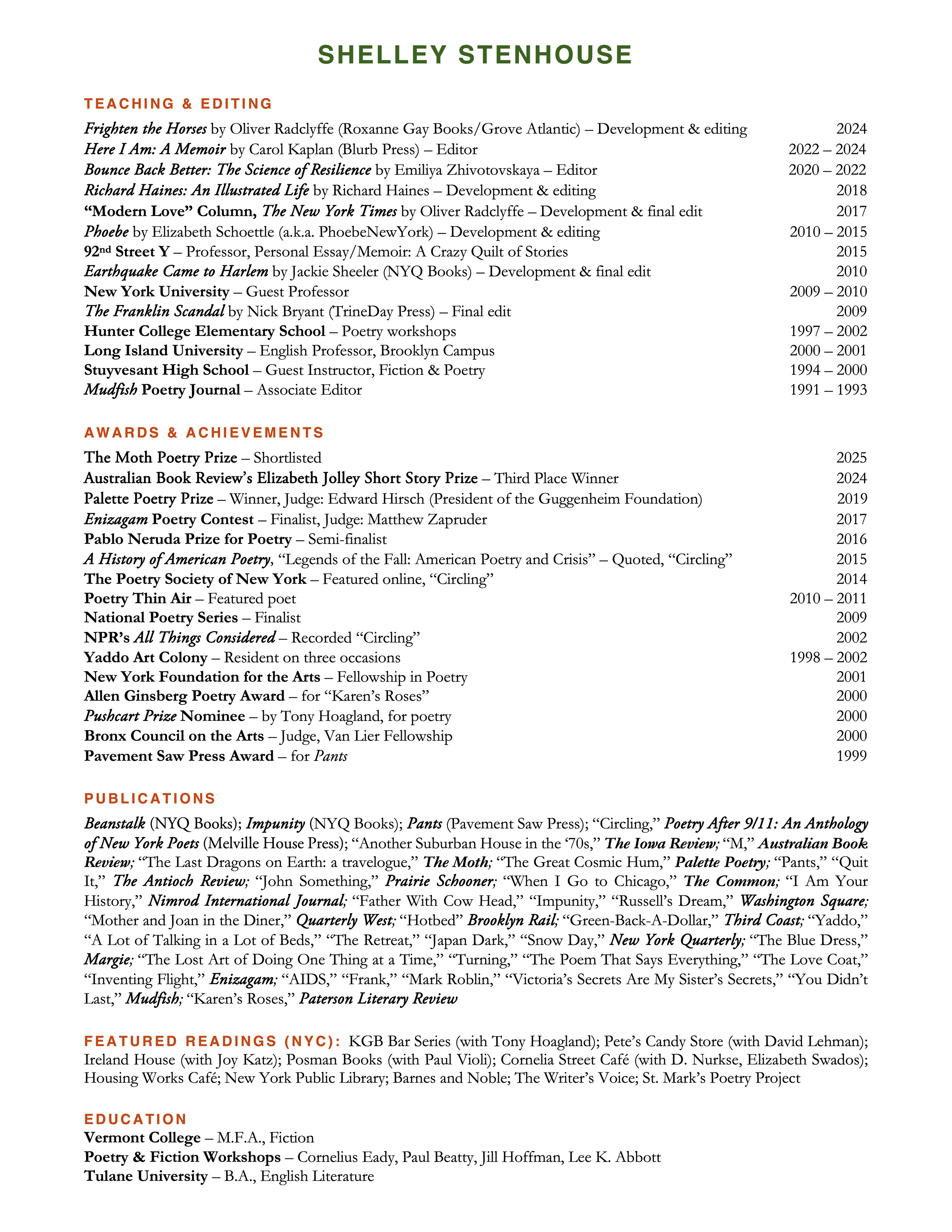 Shelley Stenhouse was recently shortlisted for the 2025 Moth Poetry Prize and won third place in Australian Book Review’s 2024 Jolley Prize for her short story “M.” Previously, she won the Palette Poetry Prize (judged by Edward Hirsch, President of the Guggenheim Foundation), the Pavement Saw Press Award for her poetry collection PANTS, a New York Foundation for the Arts (NYFA) Fellowship, and an Allen Ginsberg Award. She was a National Poetry Series finalist, had two Pushcart Prize nominations (one by Tony Hoagland), and three residencies at Yaddo Art Colony. Her poetry collection, Impunity, was published by NYQ Books. Her poem, “AIDS,” has been quoted in Poet’s Market. Her poetry and fiction have been published in New York Quarterly, Antioch Review, Prairie Schooner, The Common, Quarterly West, Nimrod International Journal, Margie, Third Coast, Brooklyn Rail, Washington Square, Enizagam, and Poetry After 9/11: An Anthology of New York Poets (among others). Her story “Another Suburban House in the ‘70s” is forthcoming in The Iowa Review and her new collection, Beanstalk, will be published this spring. Shelley has read on National Public Radio’s All Things Considered. She has taught workshops at 92nd Street Y, NYU, Hunter College Elementary School, and Stuyvesant High School.